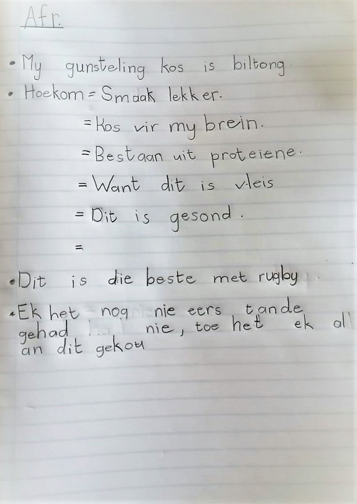 Dit lyk darem asof die Department van Onderwys of dalk die skole self herbesin het, want die afgelope paar jaar (sedert Covid met ons is) het die kinders in ons familie se toespraakformaat verander. Die jonger grade kry net ‘n onderwerp waaroor hulle ‘n minuut hoef te praat – wat ‘n baie meer sinvolle oefening is, want hulle kan baie van die werk self doen!