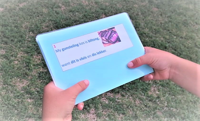 ‘Breek’ die toespraak in baie kort lyne op (sien my voorbeelde), druk en knip dit uit en plak dit op kaartjies. Plak net drie lyne per kaartjie op, sodat die kind nie hoef te sukkel om te sien waar sy is nie. Nommer die kaartjies, sodat jou kind dit maklik self in volgorde kan plaas. Jy kan selfs die lyne per kaartjie nommer as jy dink dit sal help. Help haar dan om die toespraak te hou met behulp van die kaartjies. (Elke keer as ‘n kaartjie se inhoud klaar voorgedra is, plaas sy dit onderaan al die ander.)