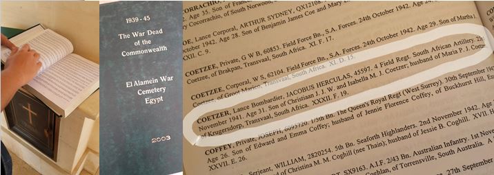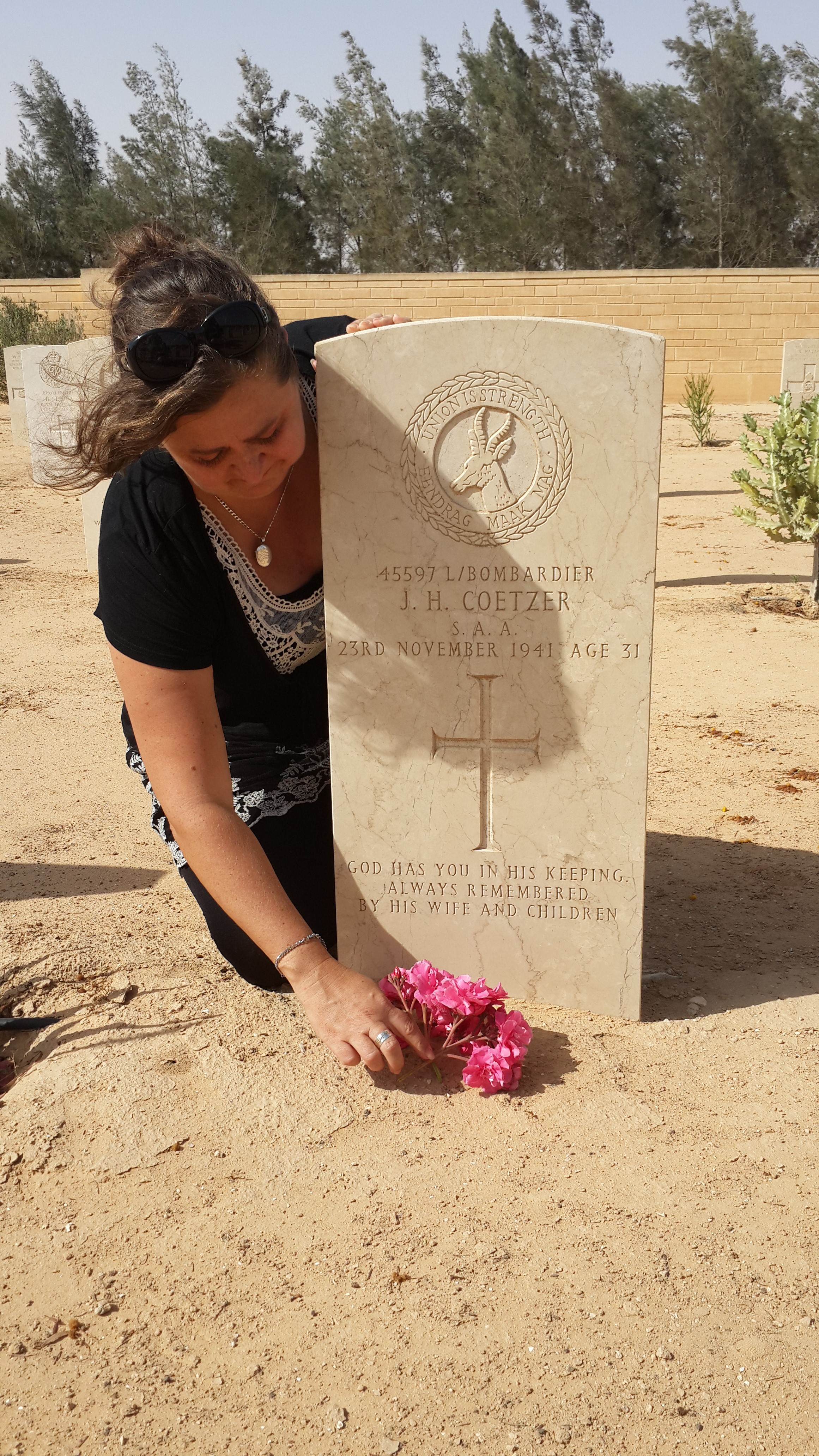 At the fourth last row, I saw Mustafa, Muhamed and my husband, Deon, coming to a standstill. My heart raced. It was really there! I reached the grave and saw a name I have seen before on funeral letters back home of family members with the same surname. Blood of my blood. It was a strange feeling, standing there, looking at the grave of Jacobus Herculas Coetzer – knowing that he was buried there 73 years ago by strange hands. I wonder how his wife felt when she visited his grave in 1954. We were the only other family members as far as we know to have visited his grave. I wondered about his children, growing up without him, and his daughter, Isabel’s words from her WhatsApp message echoed in my head. “…put a nice flower on his grave and tell him that’s from his little girl, now an old lady of 75. I was six months old when he left and two and a half when he died…”