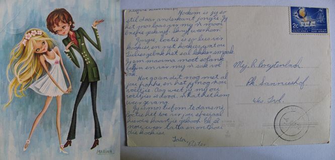 I grew up collecting postcards. It started when I went on a school tour in Standard 7 (now Grade 9) when I bought a few postcards of birds at the Transvaal Museum in Pretoria and more when visiting the Kruger National Park. I already had one postcard in my collection – dated in 1970 when I was almost two years old and he was in the Air Force already. It had a painted picture on the front of a pretty boy and girl and my much older, beloved big brother’s handwriting on the back, telling me that he missed me and that he was looking forward to come visit, so that I could bake him some cookies.